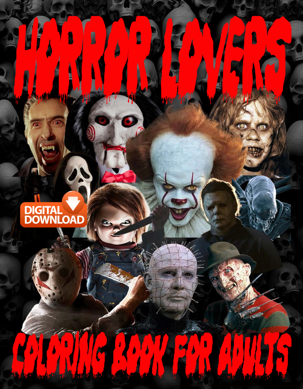 Electronic book for lovers of Horror movies! Drawings of the iconic characters of your favorite movies to color.